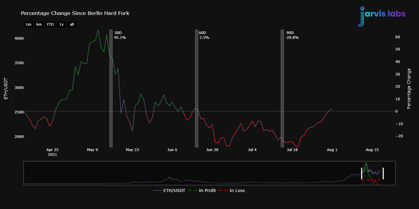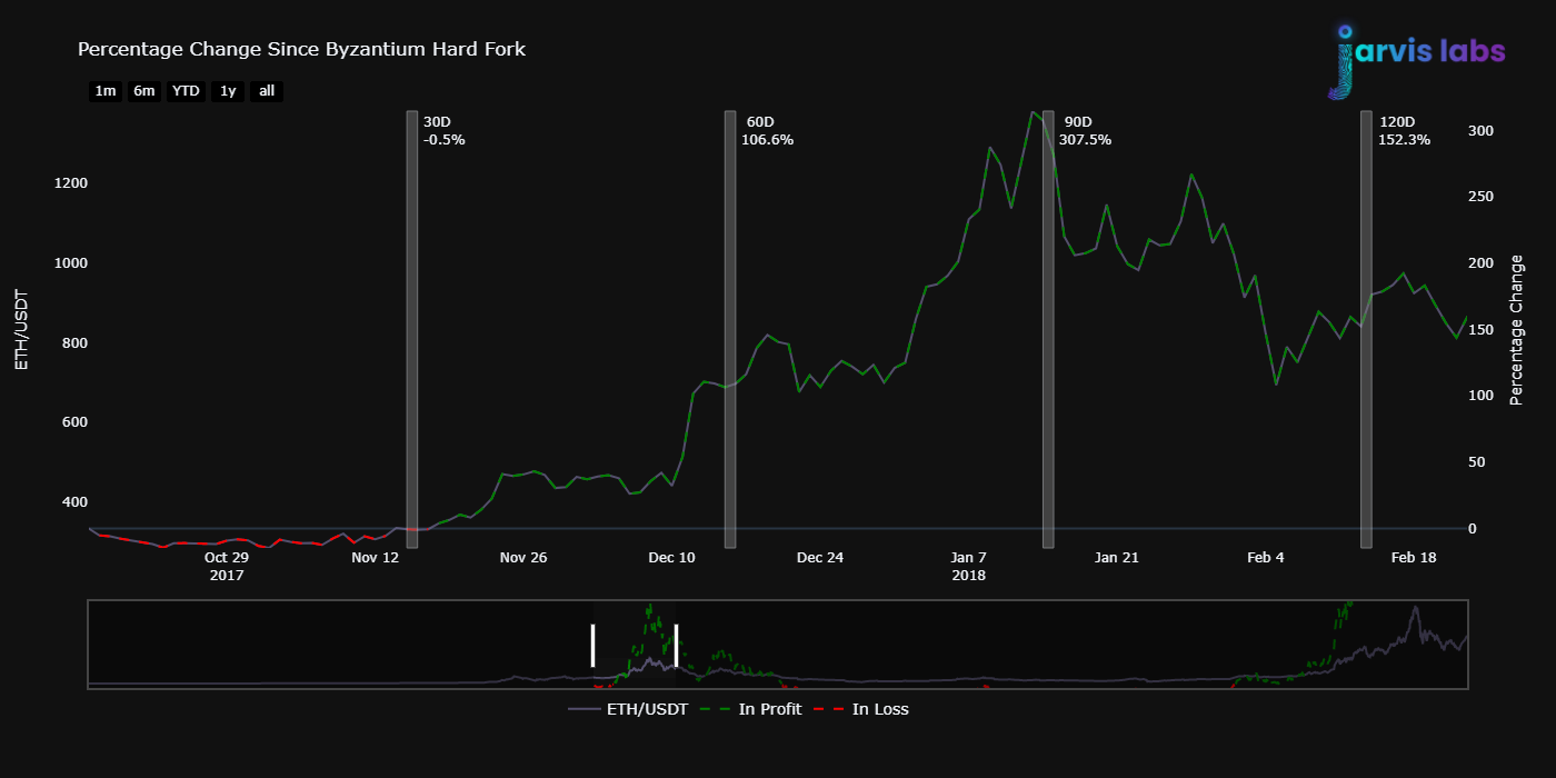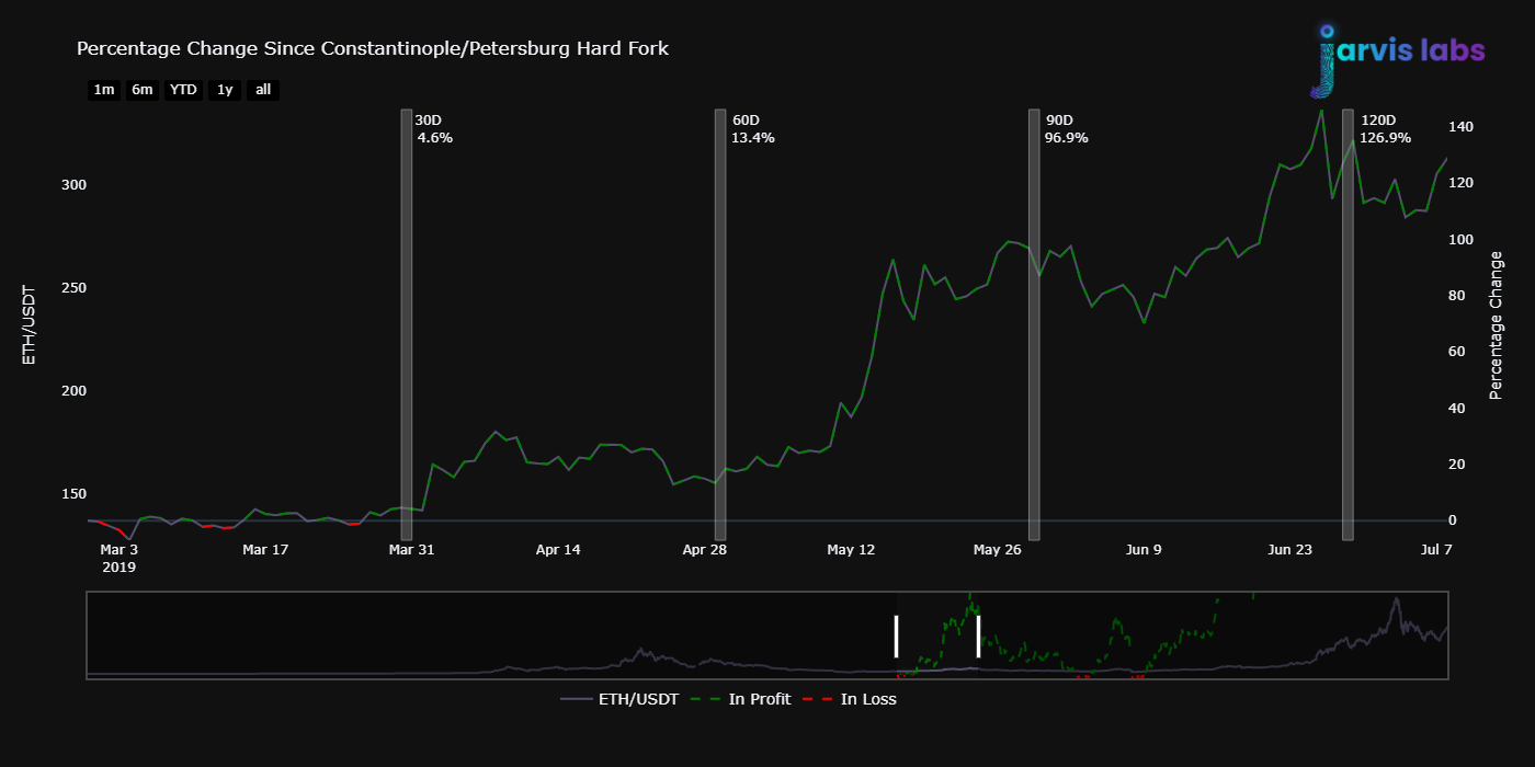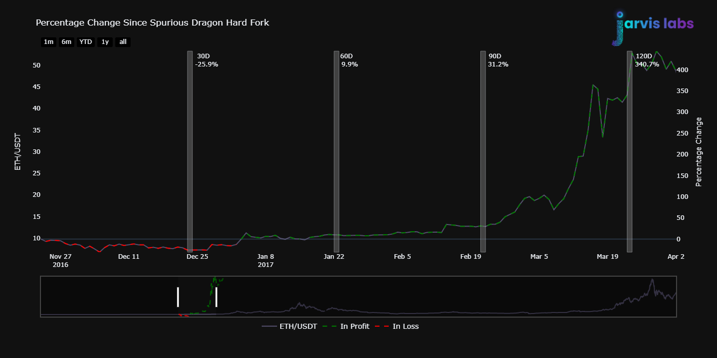The impact of Ethereum’s upgrades on the price of ETH tends to be heavily correlated with the market as a whole.