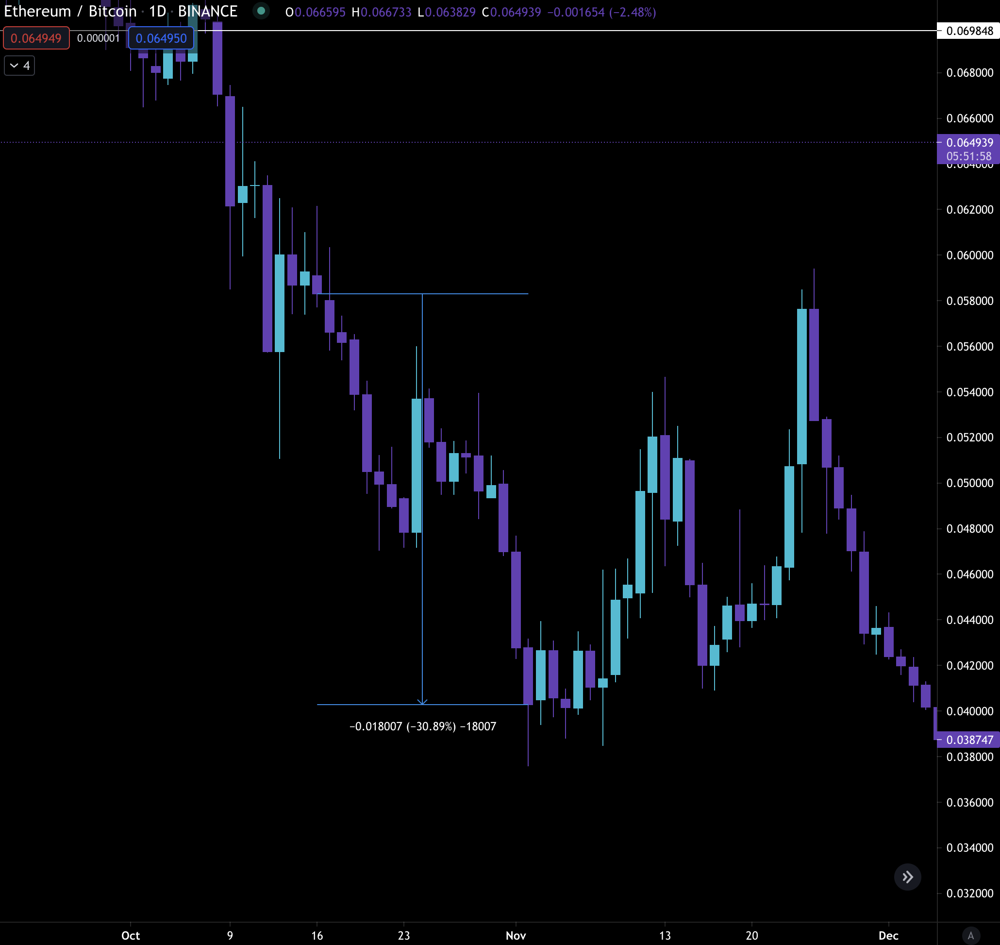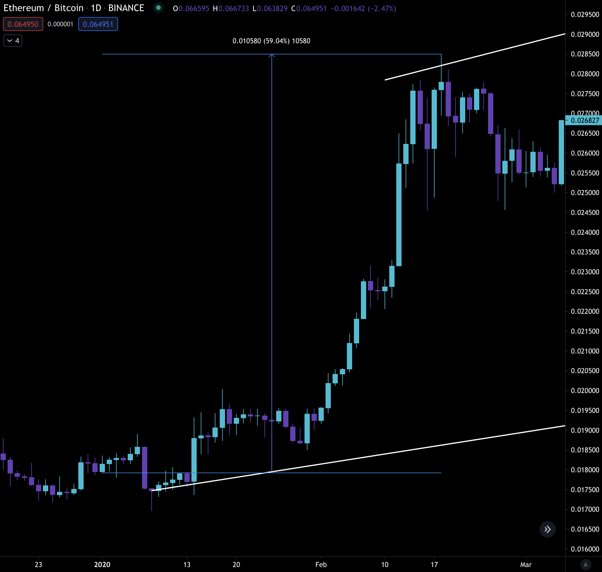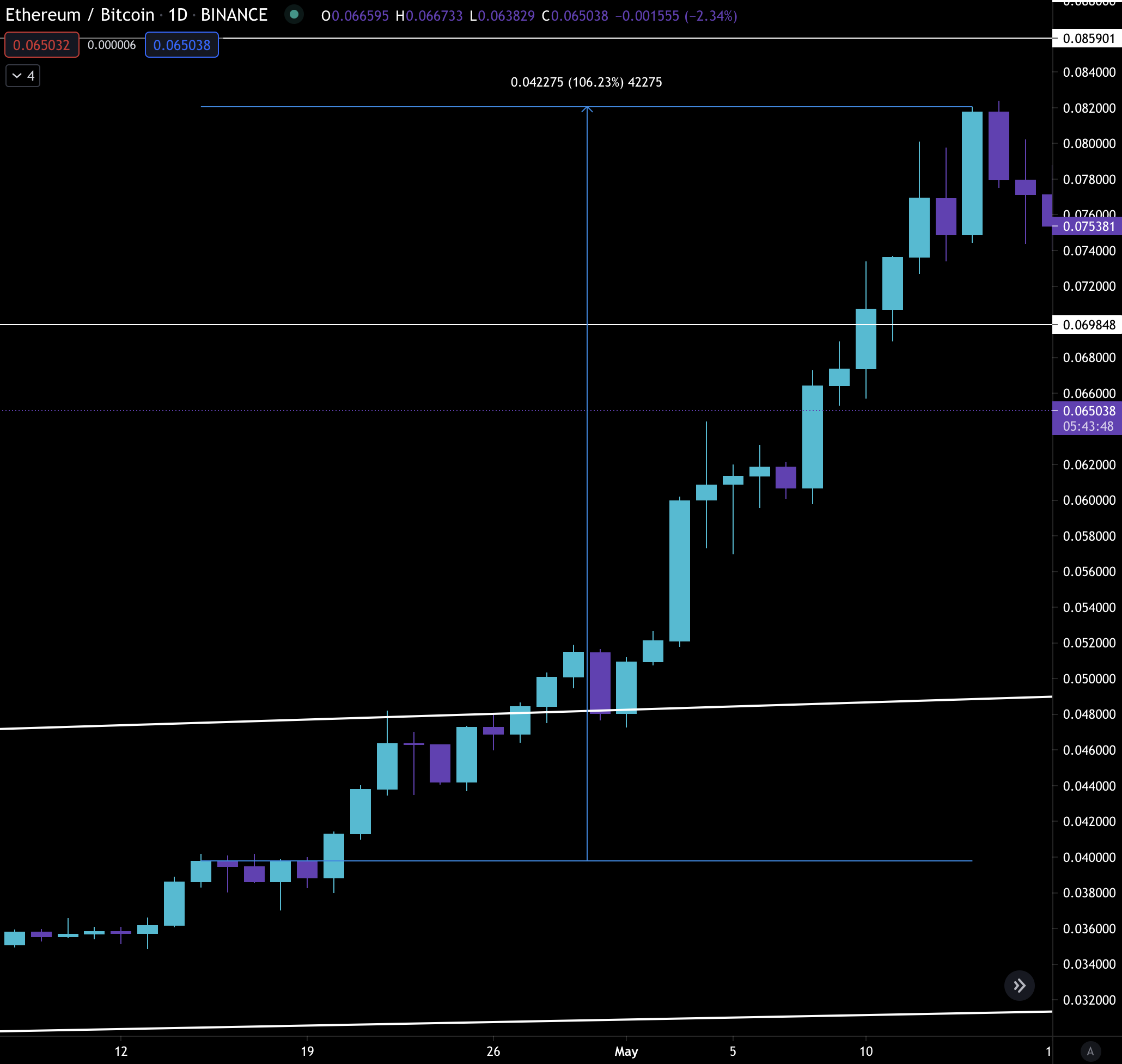 Here is the chart of Ethereum against bitcoin reflecting the strong price action in the weeks that followed.