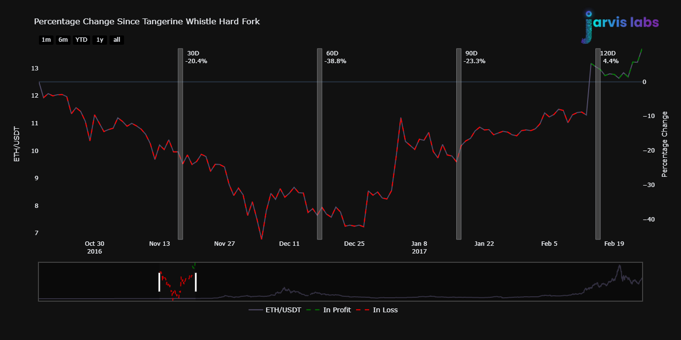 The first upgrade was Tangerine Whistle. It happened on October 18, 2016. ETH’s price at the time was $12.5.