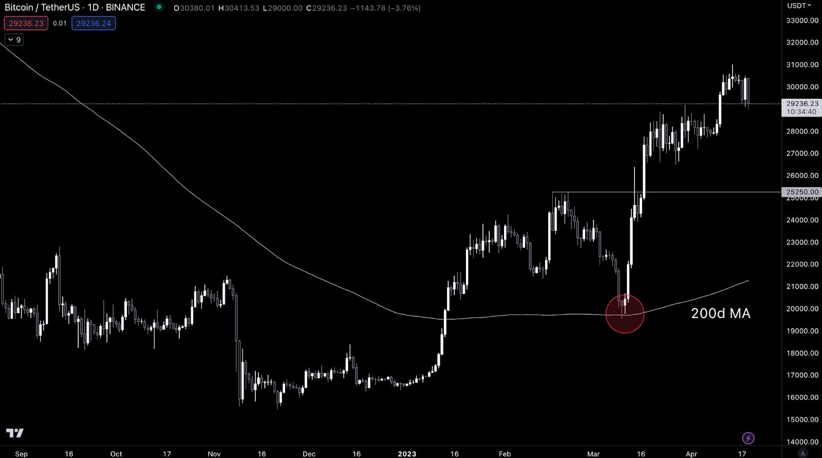 When bitcoin is coming off halving cycle lows, price does not automatically clear the 200-day MA and stay above it. Instead, it likes to return below the 200-day MA before going on to form all-time highs.