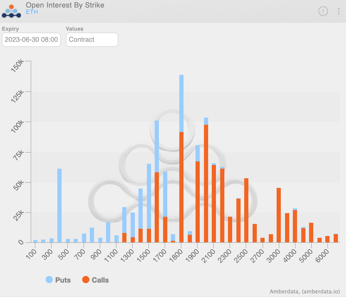 While that was a large quantity, the impact to volatility was still rather muted, as there are still a lot of contracts outstanding You can see this in the bar chart below, which shows June 30 contracts by strike price. Note the amount of call options still opened at the $1,800 strike price in the tallest bar below.